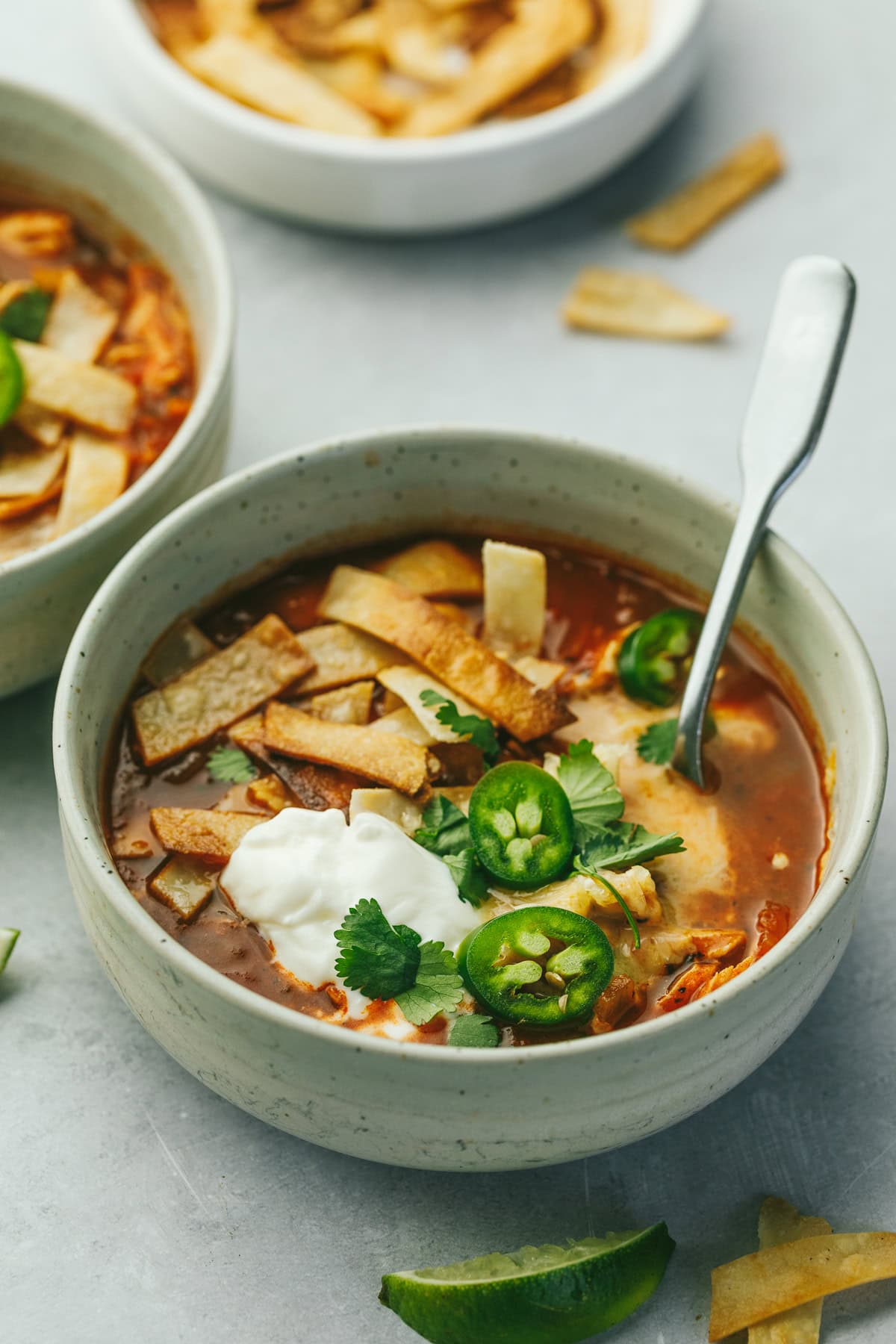- Stir in the juice of 1 lime. Serve the soup with a small handful of the fried tortilla strips and your favorite toppings (sour cream, shredded cheese, cilantro, jalapeño, etc.!).